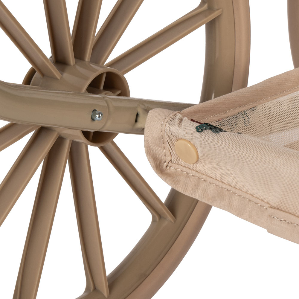 Ten wózek dla lalek ma cztery duże, stabilne koła, miękko wykończone rączki oraz pikowaną tkaninę z subtelnym wykończeniem brzegów, dzięki czemu wygląda bardzo elegancko.