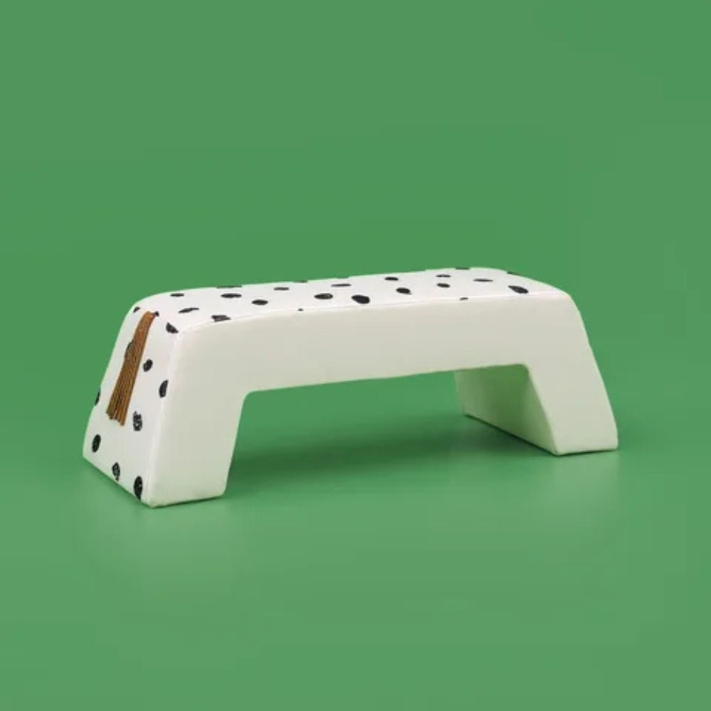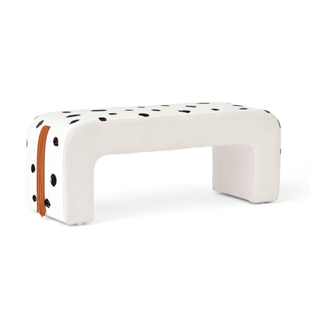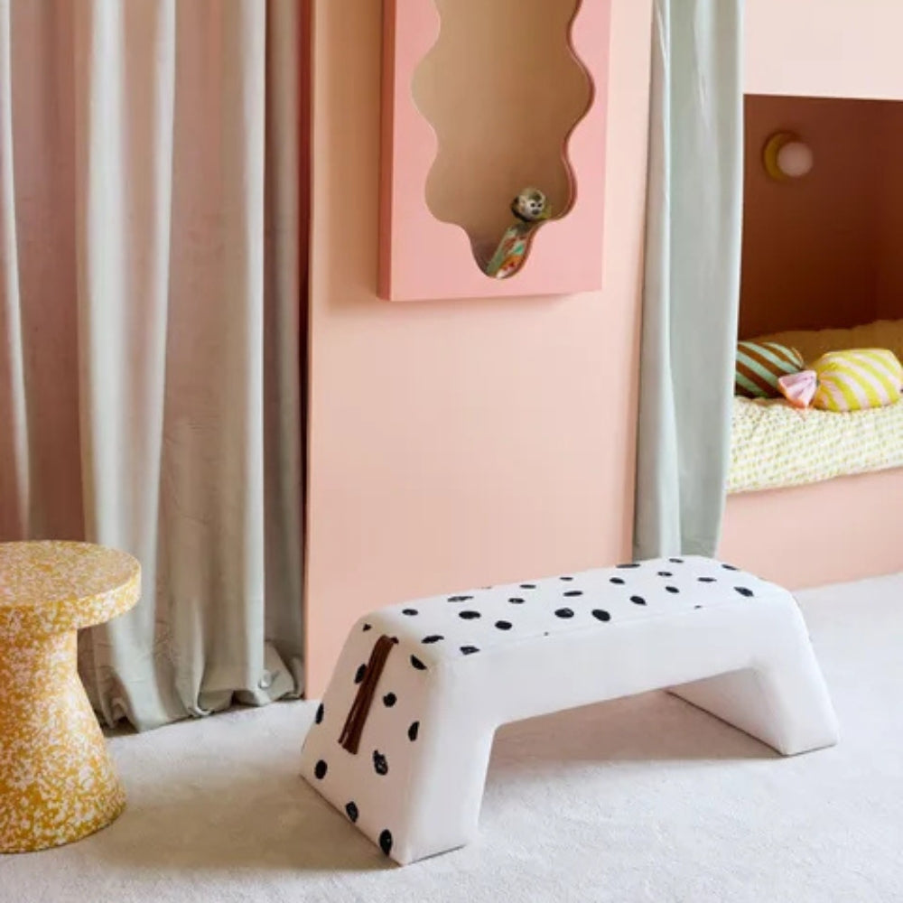 Tapicerowana tkaniną w kropki przywodzi na myśl cętkowaną sierść konika, a miękko zaokrąglone końce sprawiają, że mebel zachęca do odpoczynku i relaksu.