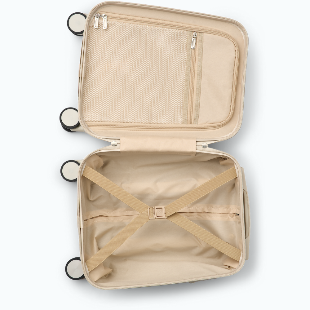 W środku znajdziesz przegrodę na zamek oraz elastyczne pasy, które utrzymają rzeczy na miejscu — to idealna walizka dla dzieci na weekendowe wypady i loty z bagażem podręcznym.