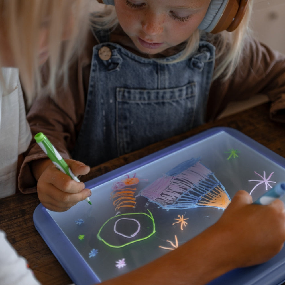 Z drugiej strony znajduje się fluorescencyjna powierzchnia, która ożywa w ciemności dzięki neonowym markerom, dając dzieciom zupełnie nowe możliwości twórcze.