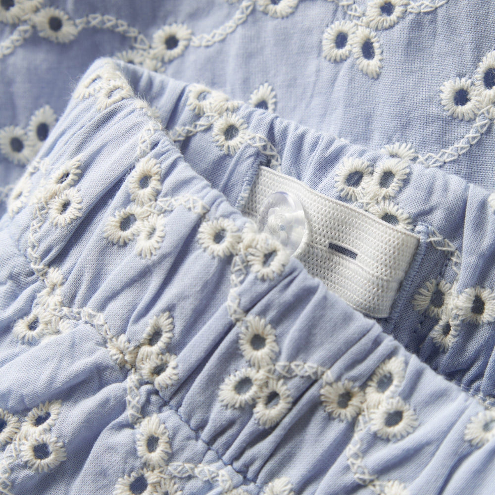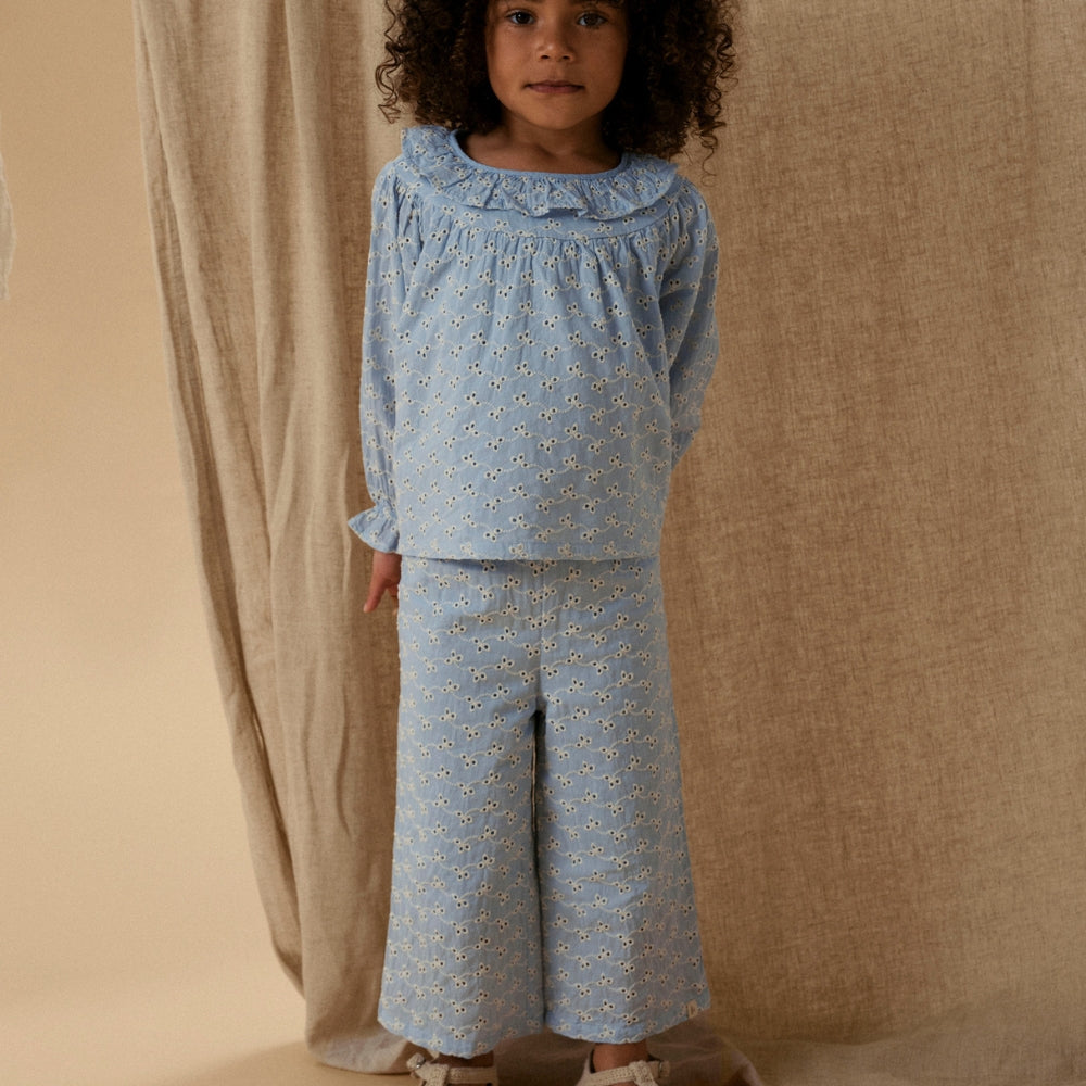 Niebieski kolor i subtelny kwiatowy wzór nadają im dziewczęcego uroku, a klasyczny krój sprawia, że spodnie dziecięce Lil’ Atelier łatwo dopasować do ulubionych bluzek, sweterków czy koszul.