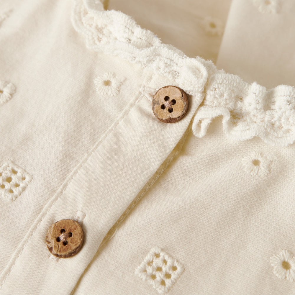 Lekki, przewiewny materiał sprawia, że maluch czuje się swobodnie niezależnie od pory roku. Lil’ Atelier łączy ponadczasowy styl z naturalnymi tkaninami, tworząc ubrania, które urzekają prostotą i jakością.