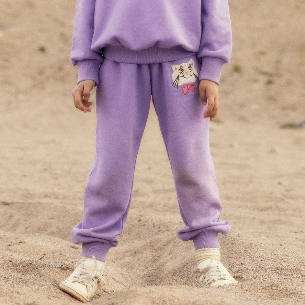 Mini Rodini Spodnie dresowe dla dzieci Cat with bowtie Purple