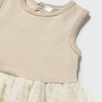 Ten uroczy Komplet od Mayoral łączy miękki sweterek zapinany na guziki z lekką sukienką na ramiączkach z tiulem – idealny zestaw na rodzinne wyjścia i wyjątkowe okazje.