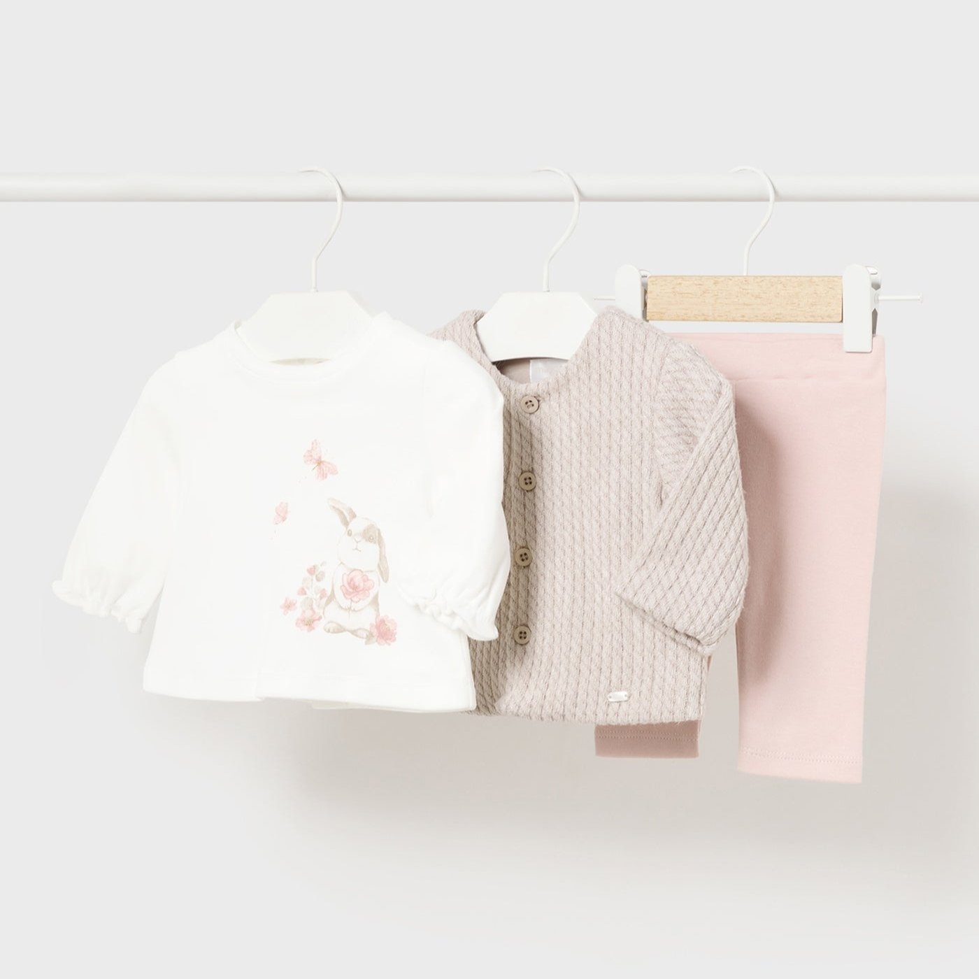 Ubranka dla niemowlaka marki Mayoral to fantastyczny 3-częściowy komplet z króliczkiem.