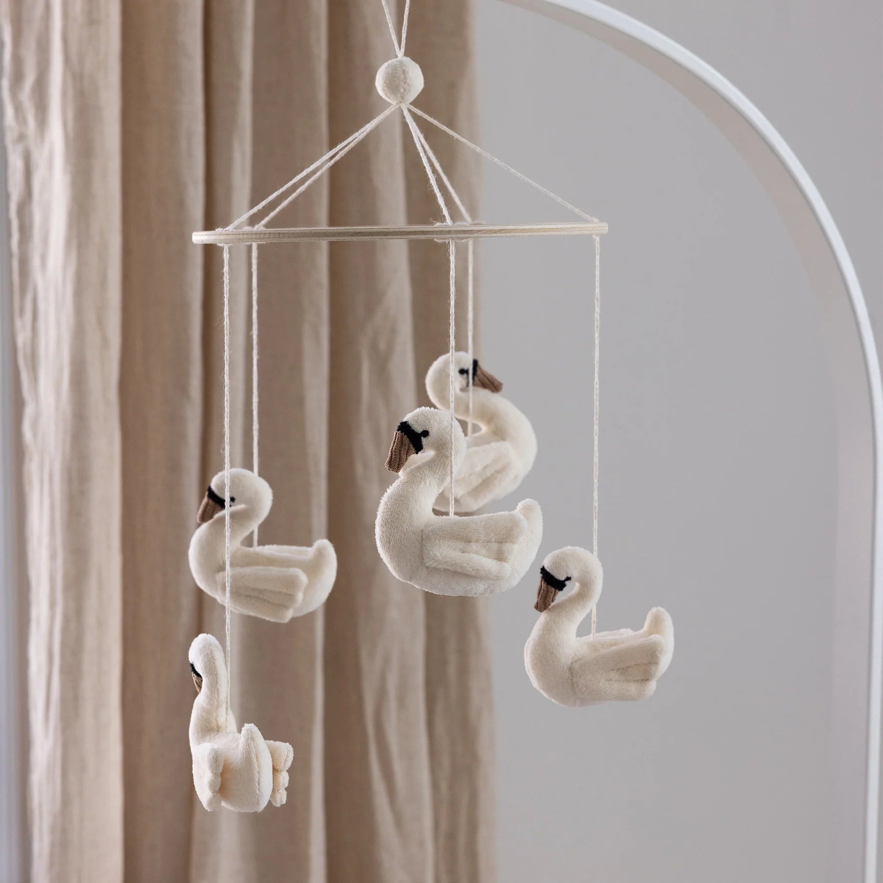 Karuzelka do łóżeczka Sebra z pięcioma miękkimi łabędziami unoszącymi się na delikatnej drewnianej obręczy to piękny sposób na stworzenie spokojnej, kojącej atmosfery nad łóżeczkiem lub przewijakiem.