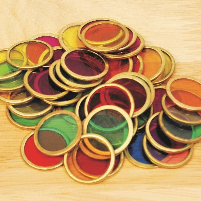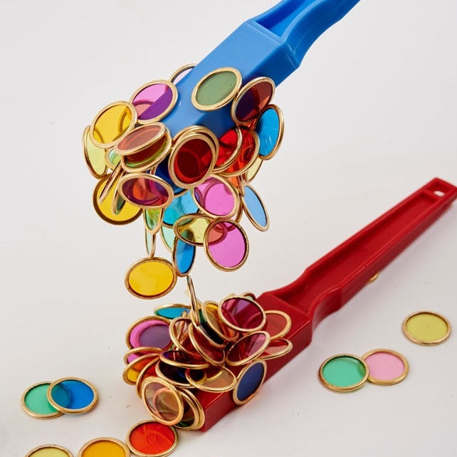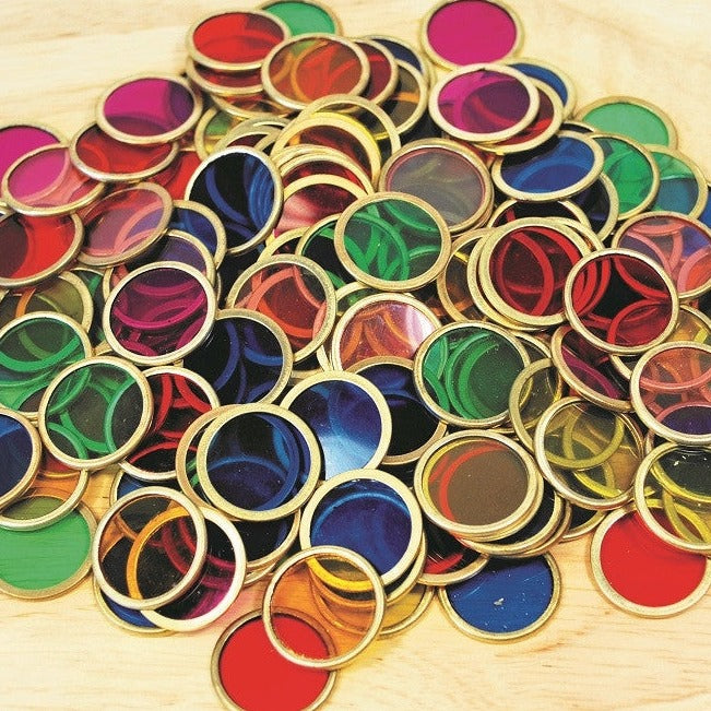 Kolorowe przezroczyste żetony z metalowymi obręczami, idealne do użycia z magnetycznymi różdżkami.