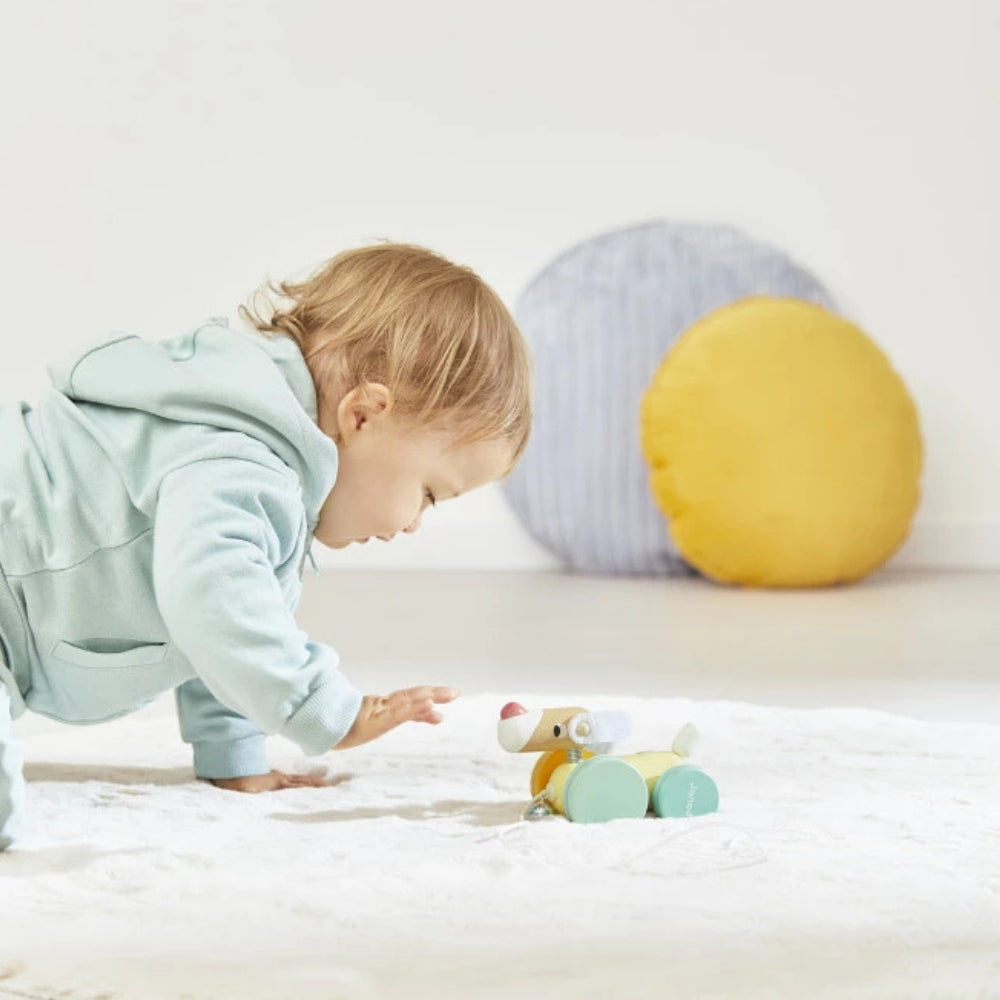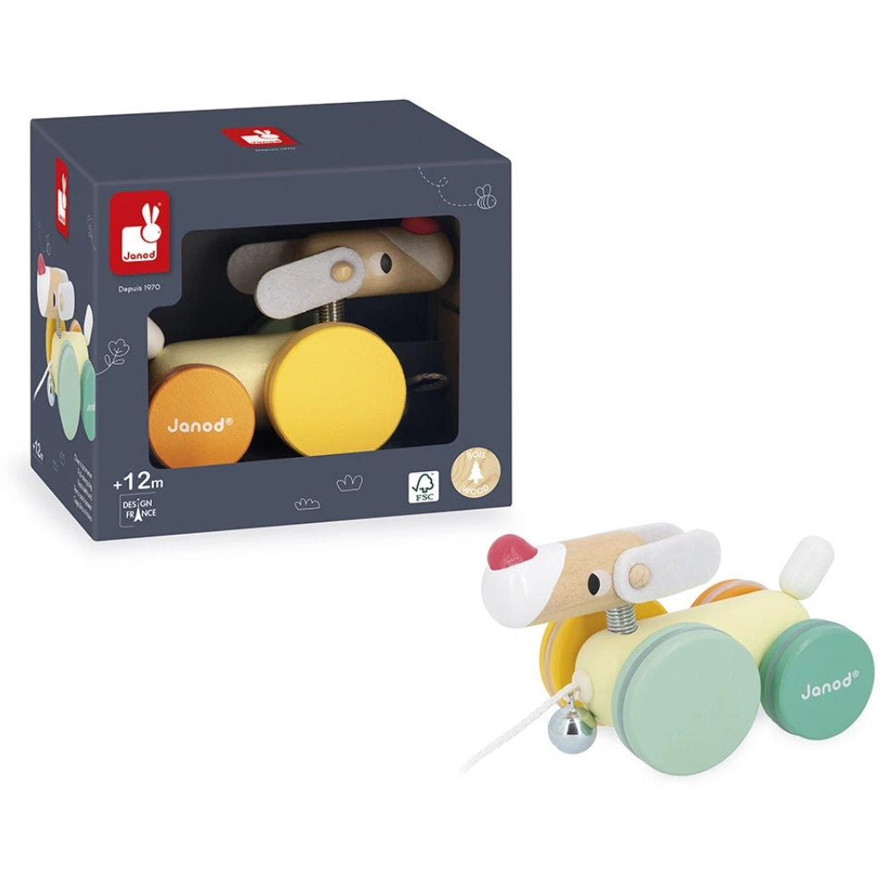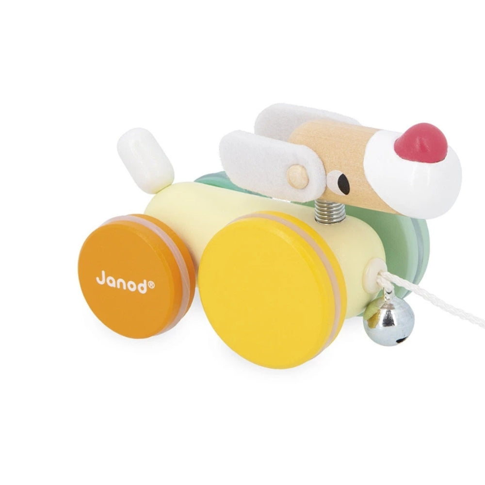 Zabawka do ciągnięcia Janod to uroczy, kolorowy piesek na kółkach, który szybko zostaje ulubionym towarzyszem małych spacerów.