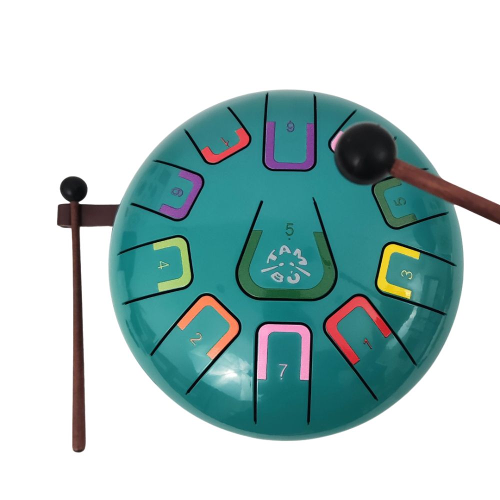 Bębenek dla dzieci ma stalową konstrukcję typu tongue drum, a jego brzmienie jest aksamitne, relaksujące i nienachalne dla domowników.