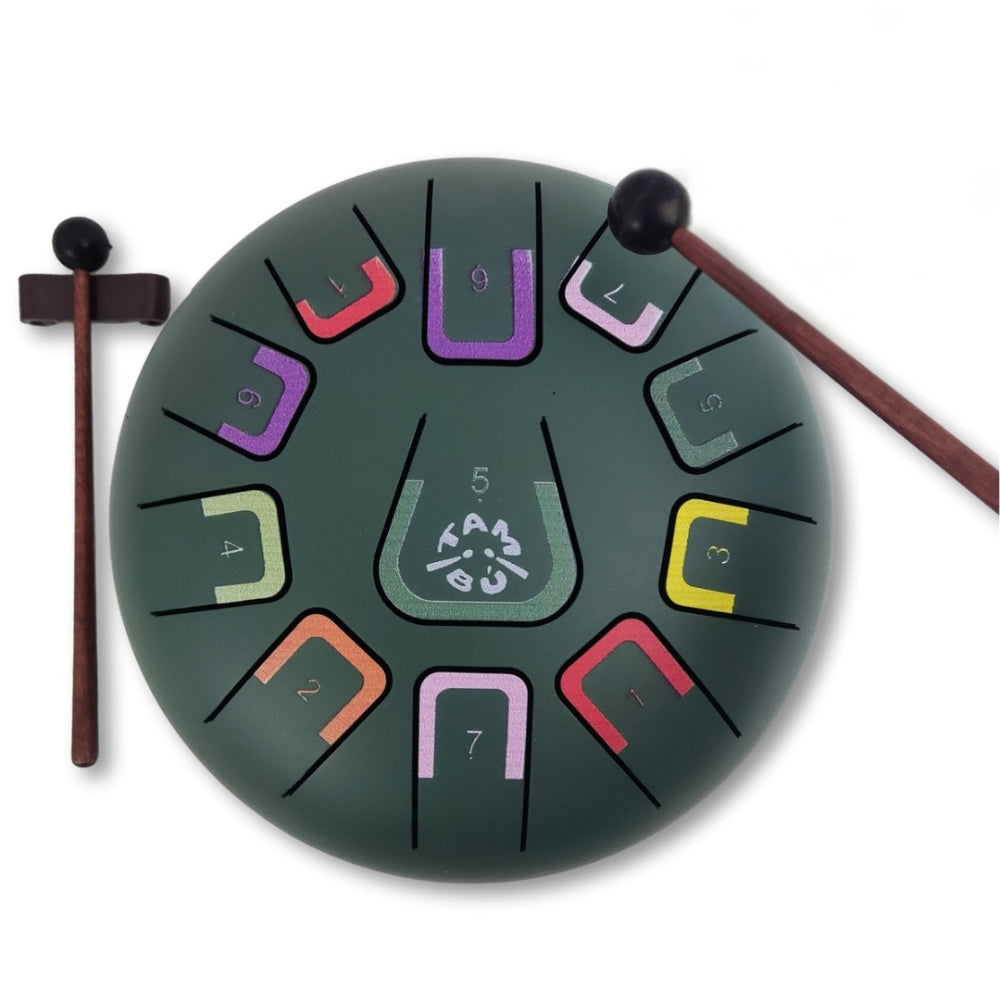 Bębenek dla dzieci ma stalową konstrukcję typu tongue drum, a jego brzmienie jest aksamitne, relaksujące i nienachalne dla domowników.