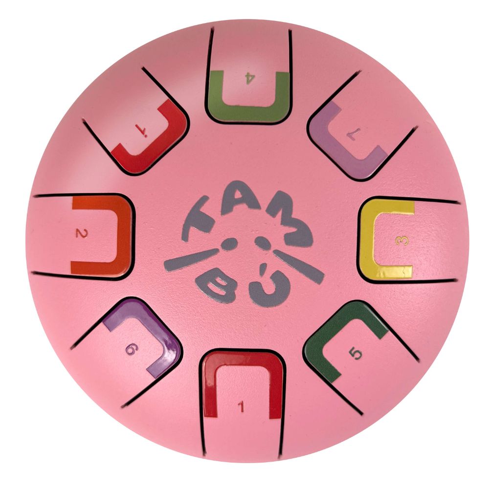 Bębenek dla dzieci ma stalową konstrukcję typu tongue drum, a jego brzmienie jest aksamitne, relaksujące i nienachalne dla domowników.