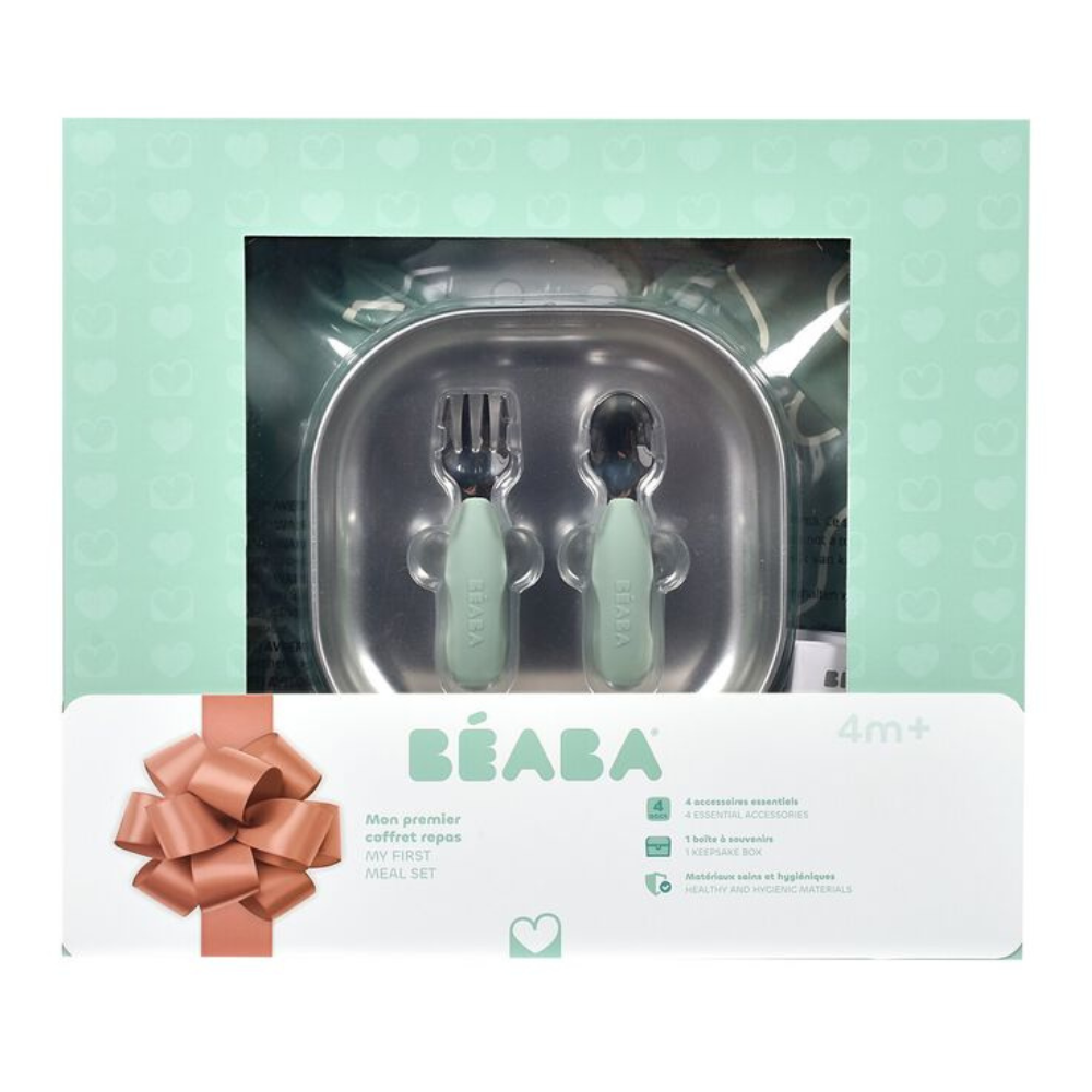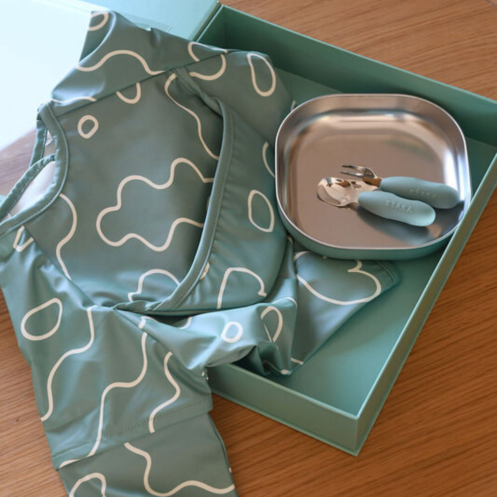 Beaba Beaba Zestaw prezentowy First Meals 3w1 talerzyk + zestaw sztućców + śliniak Sage green