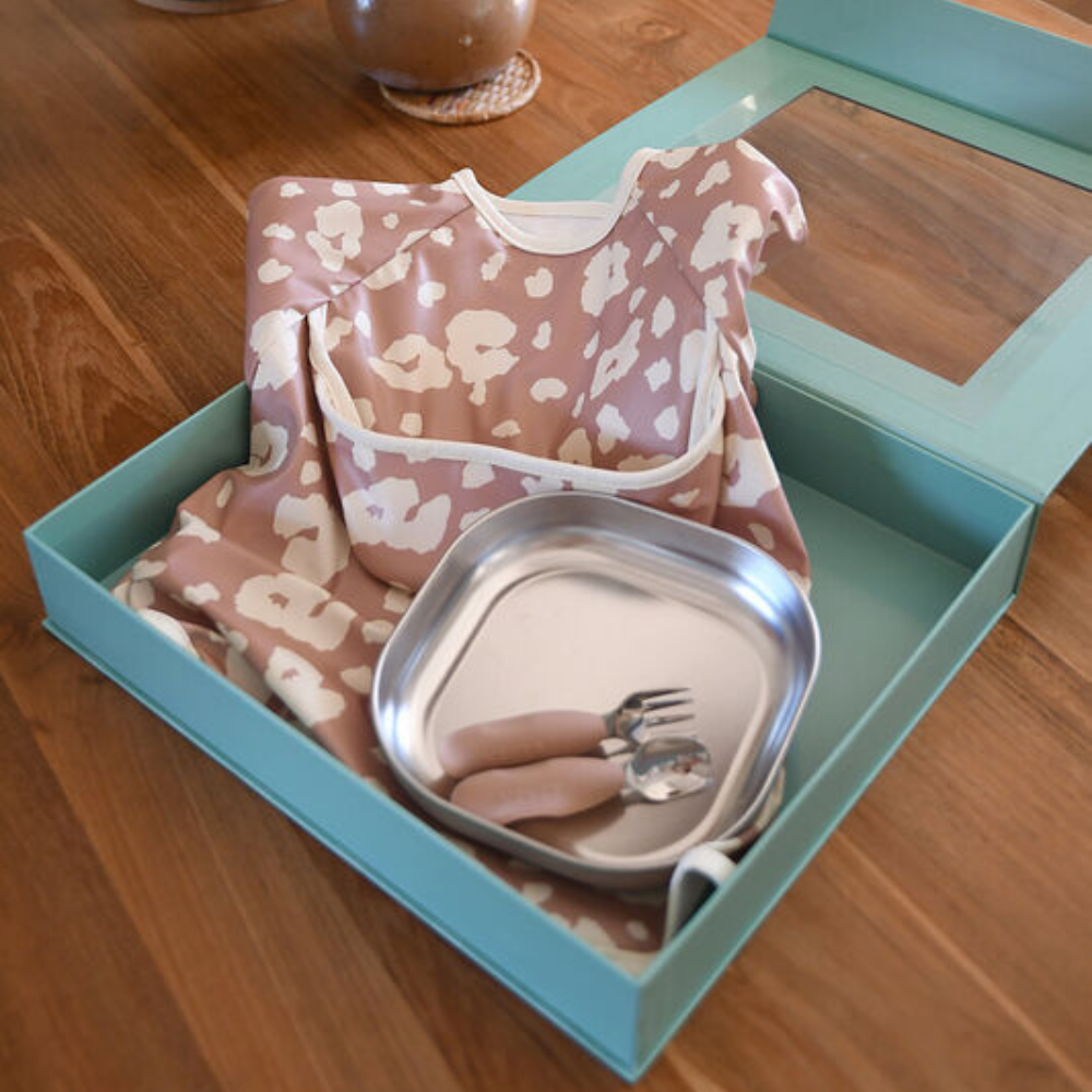 Elegancki i kompletny zestaw od 4. miesiąca życia zawiera talerz, sztućce treningowe oraz śliniak z rękawkami, zapakowane w trwałe pudełko pamiątkowe.