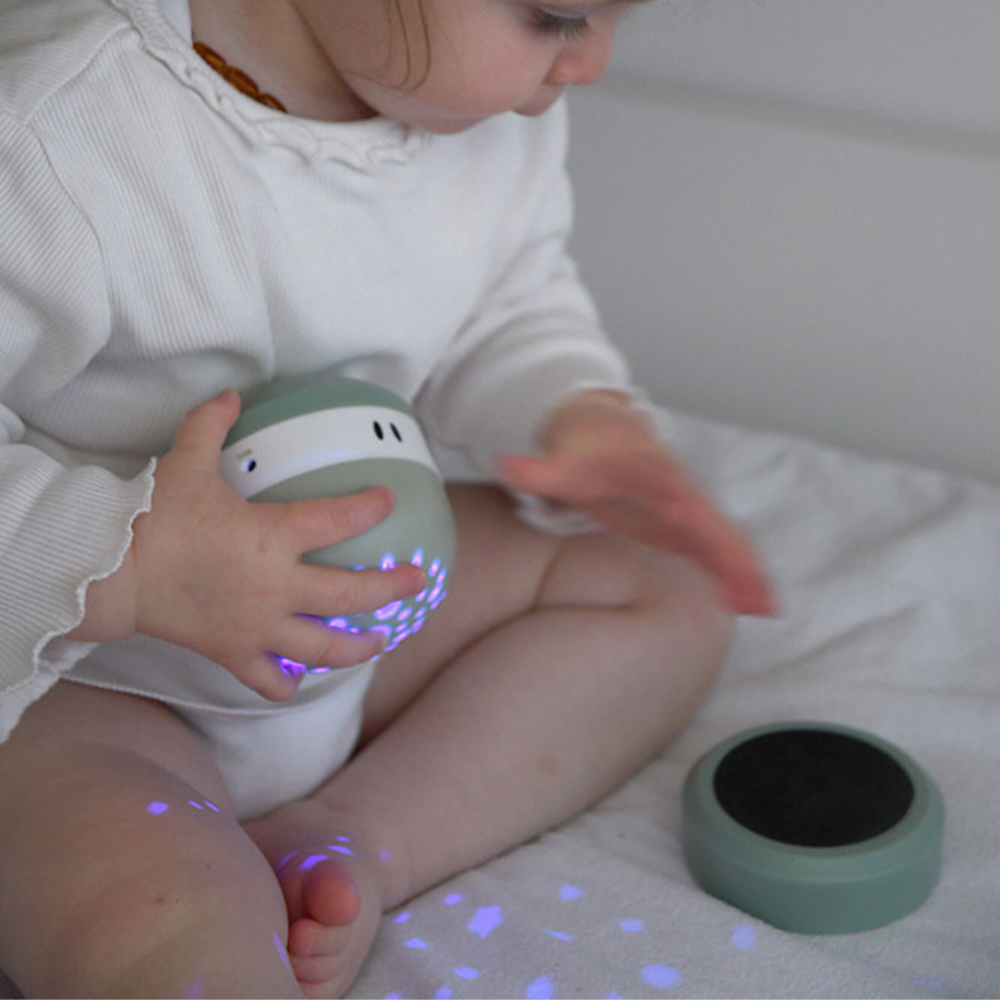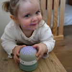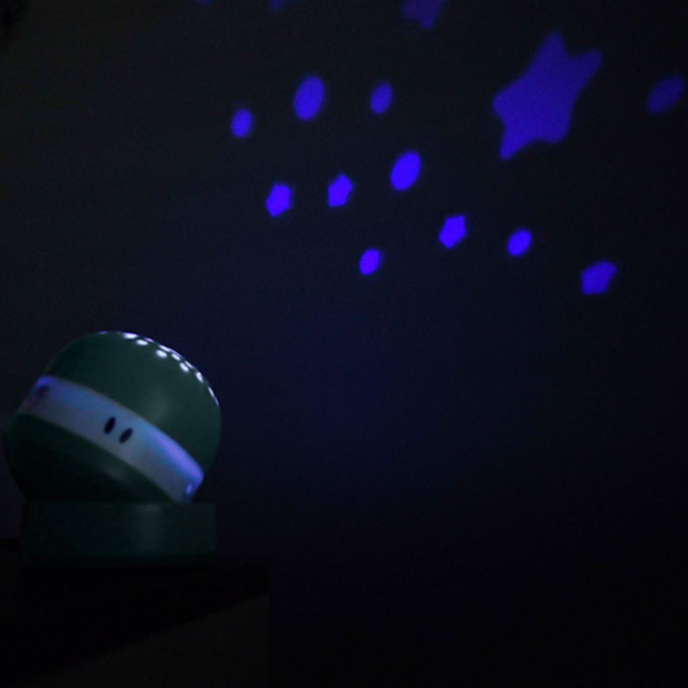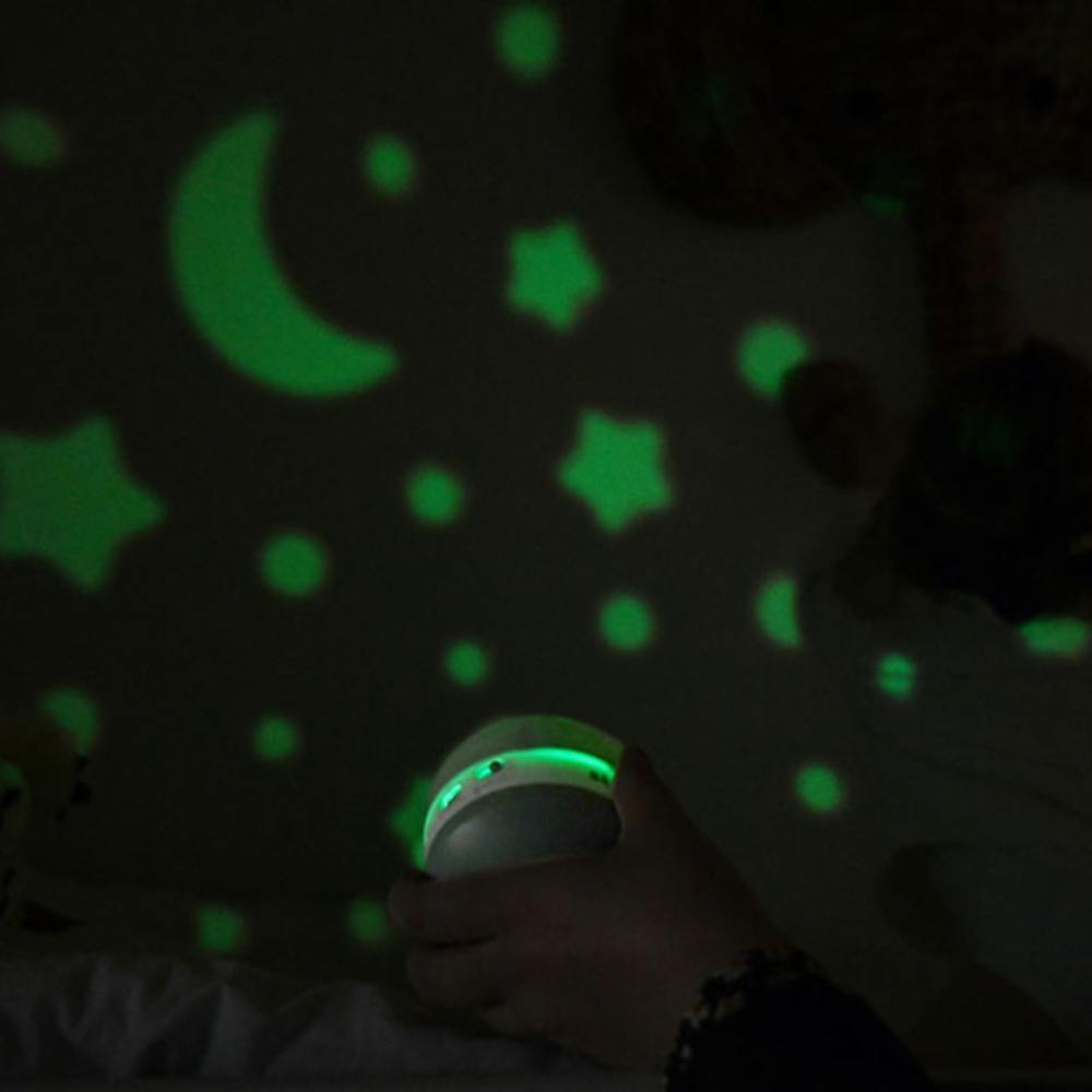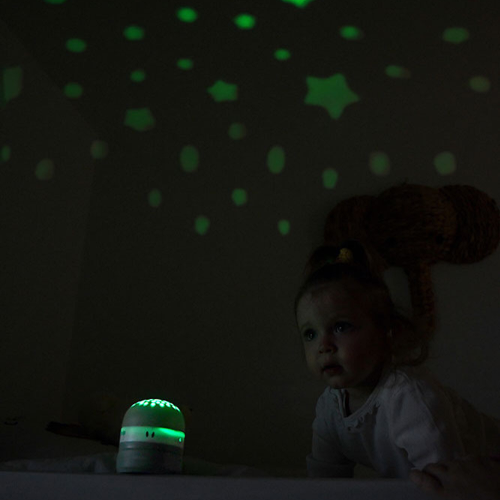 Ten kompaktowy projektor pomaga maluchowi wyciszyć się przed snem, otulając go delikatnym, rozgwieżdżonym niebem i kojącymi dźwiękami.