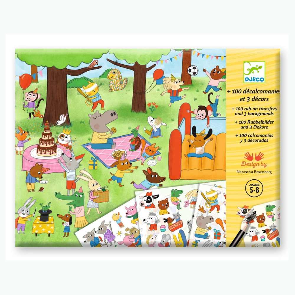 Zestaw kalkomanii od Djeco przeniesie dziecko w barwny świat urodzin, karnawału i festiwali — pełen śmiesznych postaci i scenek, które można tworzyć wciąż na nowo.