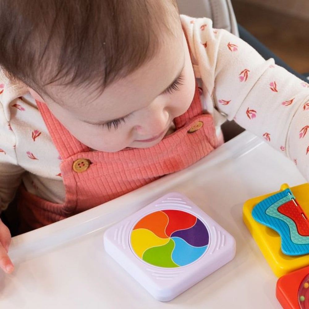 Sensoryczny kwadrat od Fat Brain Toys to angażująca zabawka aktywności, która przyciąga wzrok dziecka ruchomą, kolorową tarczą i zachęca do eksplorowania za pomocą rączek.