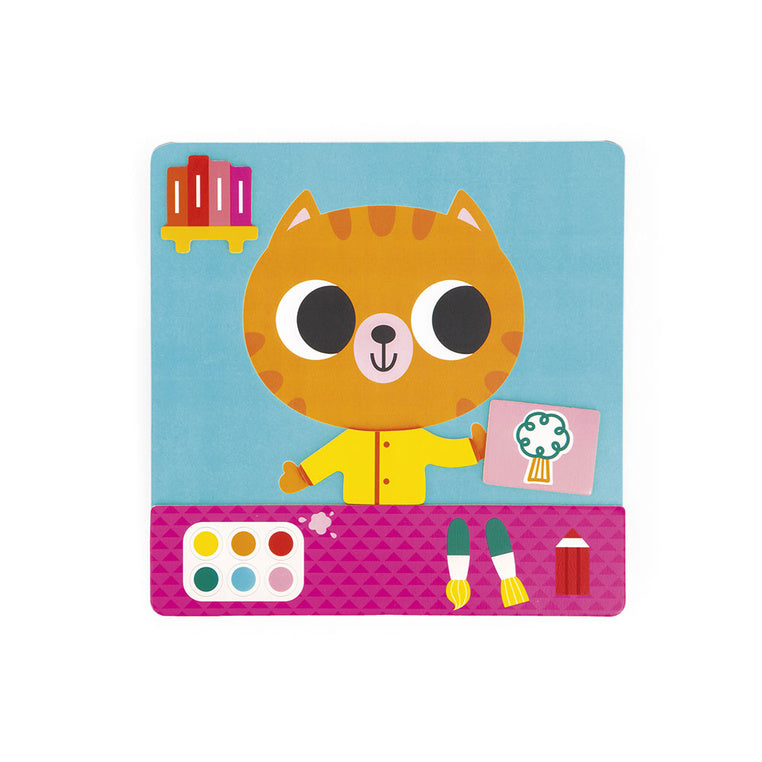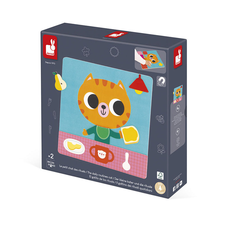 W zestawie znajduje się plansza z uroczym rudym kotem oraz 30 magnesów przedstawiających jego ubrania, posiłki, elementy domu i akcesoria.