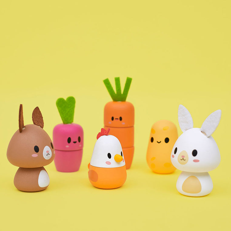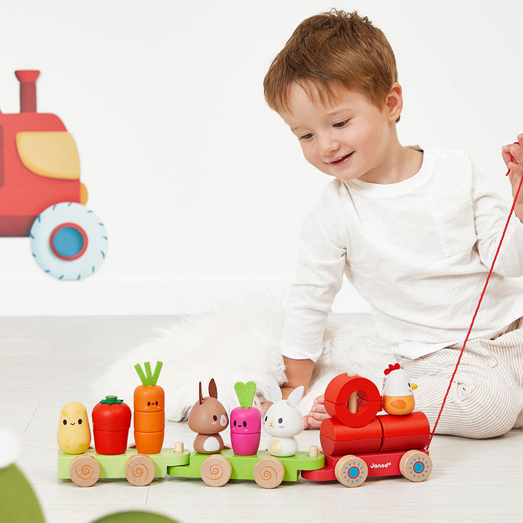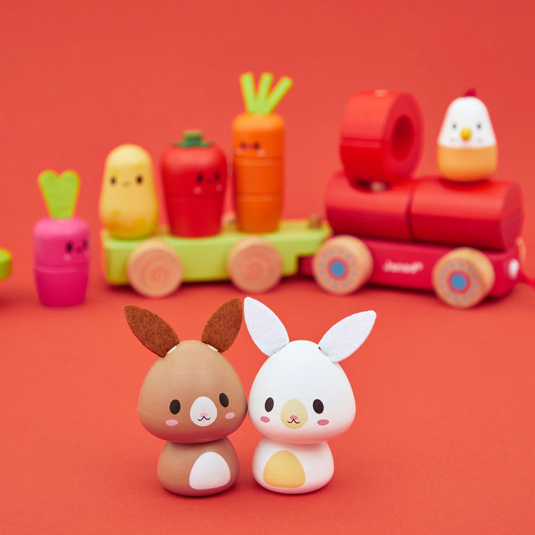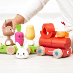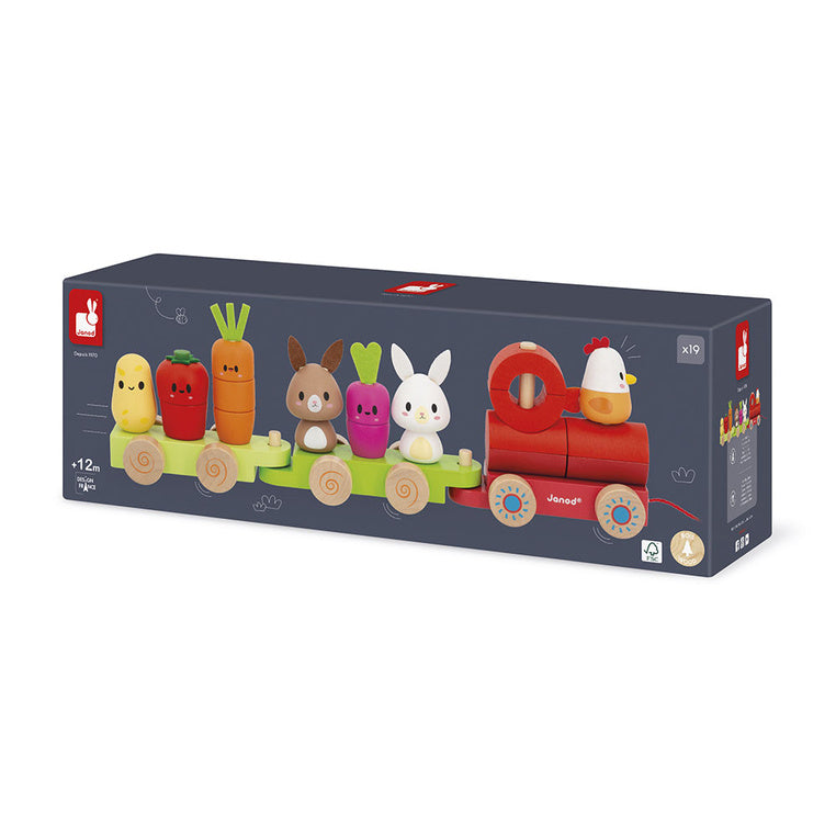 Zestaw składa się z trzech wagoników z drążkami oraz aż 19 kolorowych elementów do układania – w tym części lokomotywy, kurki, królików, warzyw takich jak ziemniak, pomidor, burak czy wieloczęściowa marchewka.