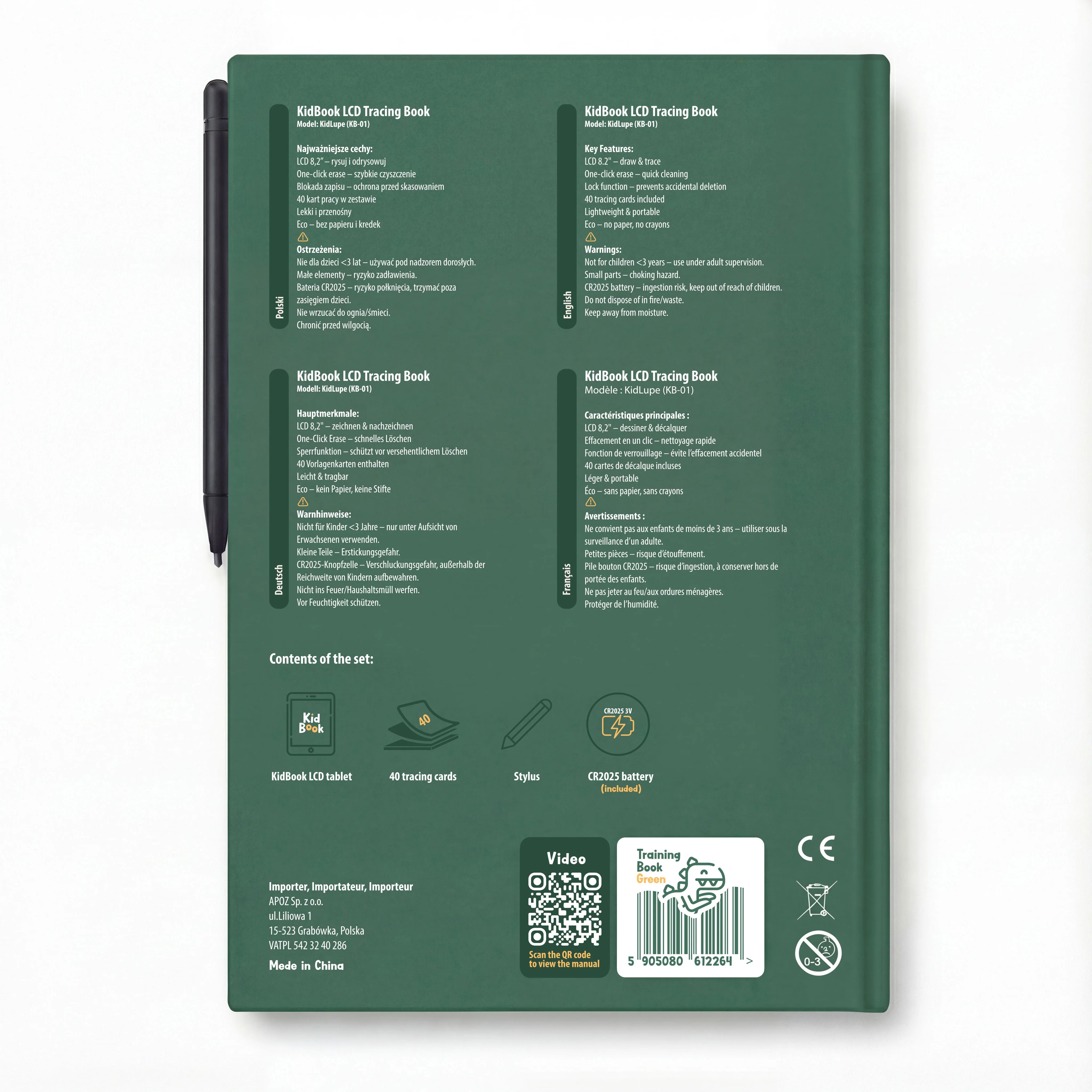 • Zawartość zestawu: tablet LCD KidBook, 40 kart pracy (20 dwustronnych), rysik