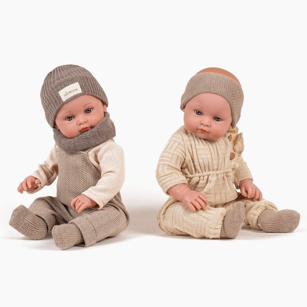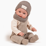 lalka Yann marki Minikane to uroczy bobas z kolekcji Bambinis o wysokości 47 cm, ubrany w kompletny zestaw: beżowe ogrodniczki z bawełny w jodełkę, t-shirt z długim rękawem w kolorze écru, szary dzianinowy czapeczek, dopasowany komin oraz szare skarpetki.