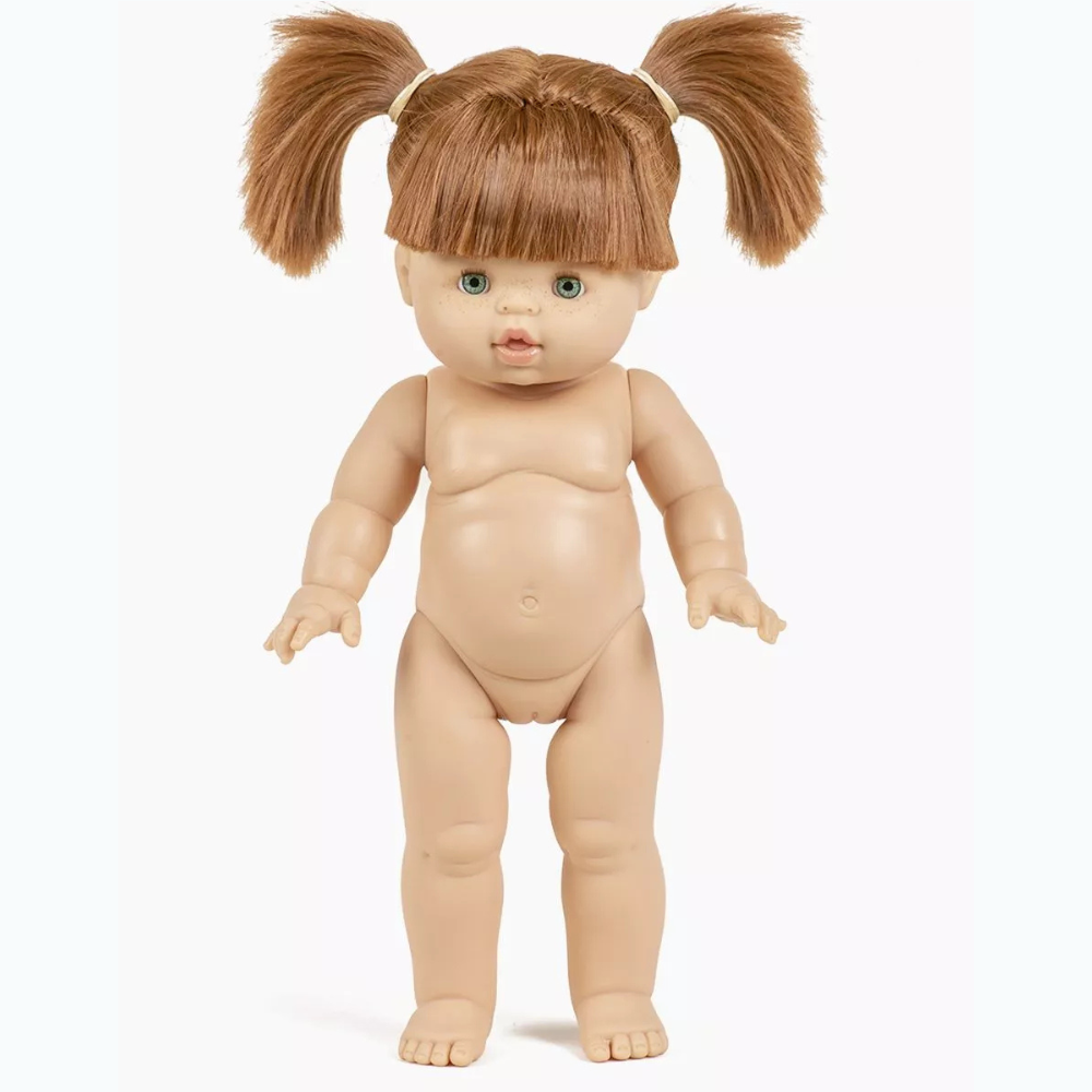 Ma rude włosy związane w urocze kitki, zielone oczy i stabilnie stoi dzięki prostym nóżkom, więc łatwo ją ustawiać podczas zabawy w dom czy przedszkole.