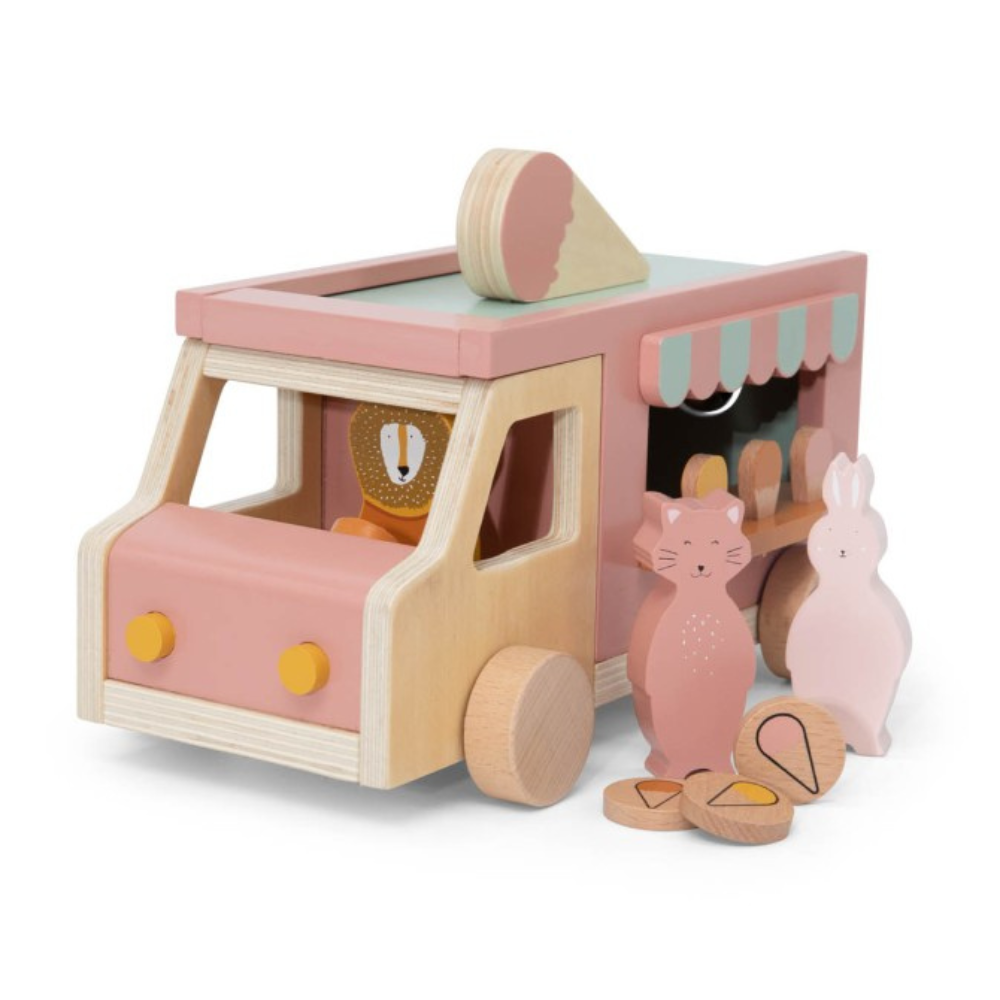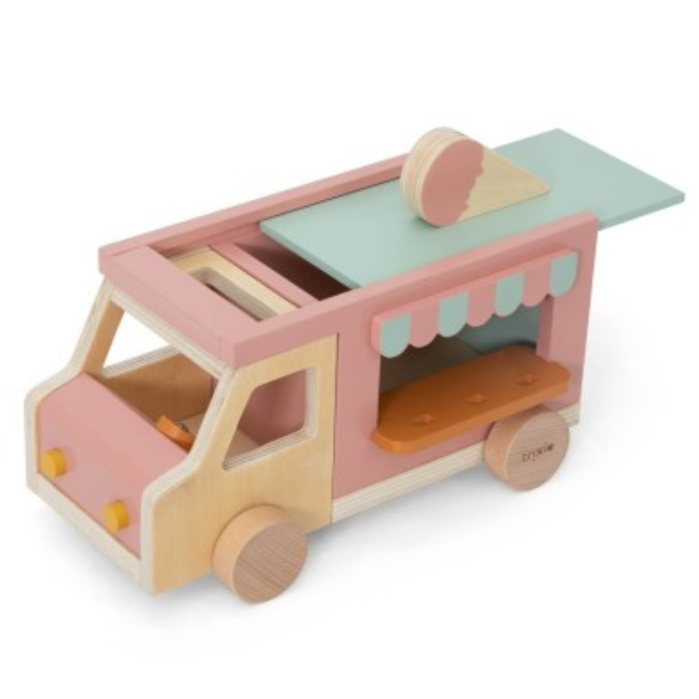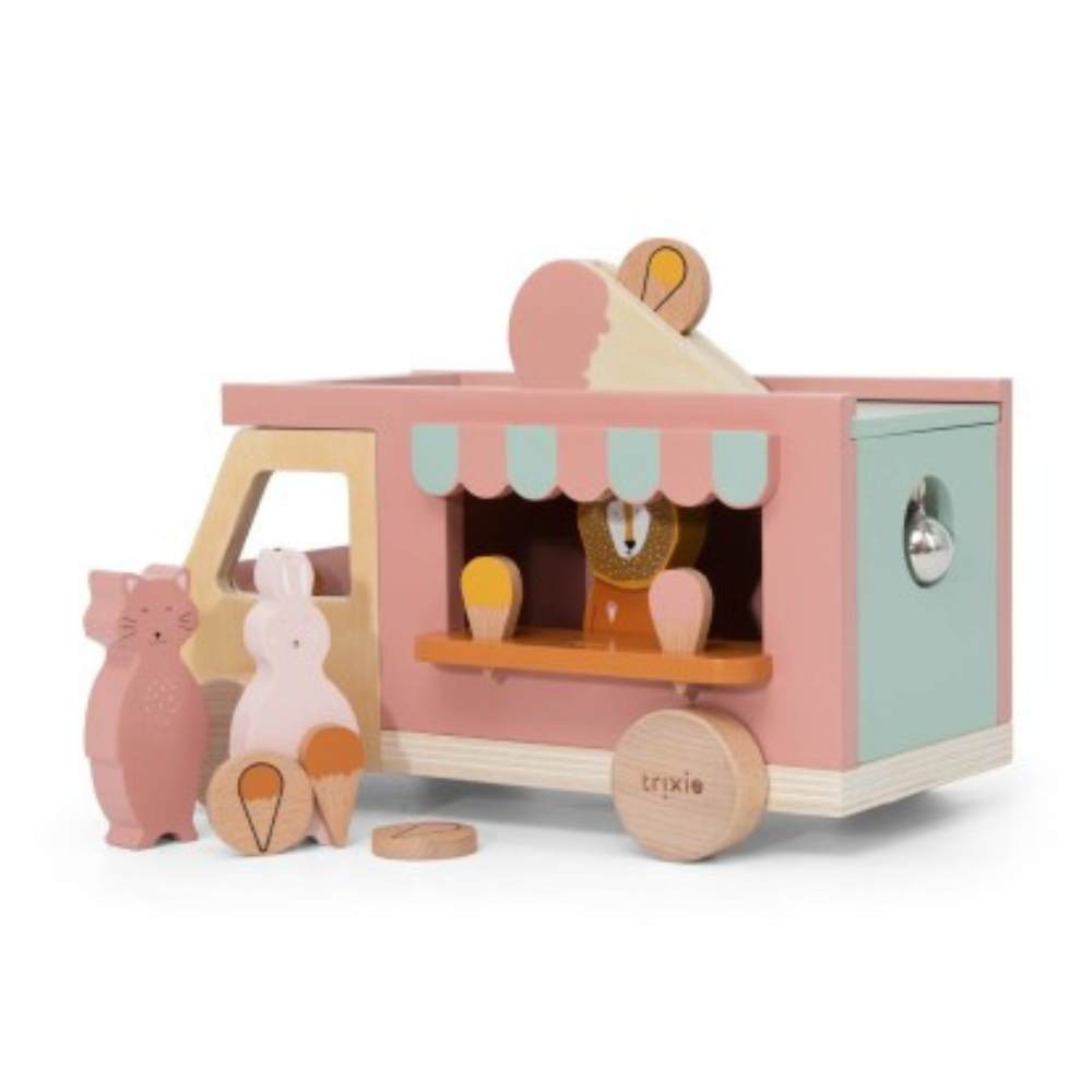 Drewniana ciężarówka jest gotowa na codzienne, kreatywne „lodziarskie” przygody. Zabawka Trixie świetnie wpisze się w domowe teatrzyki, sklepiki i scenki z ulubionymi bohaterami.