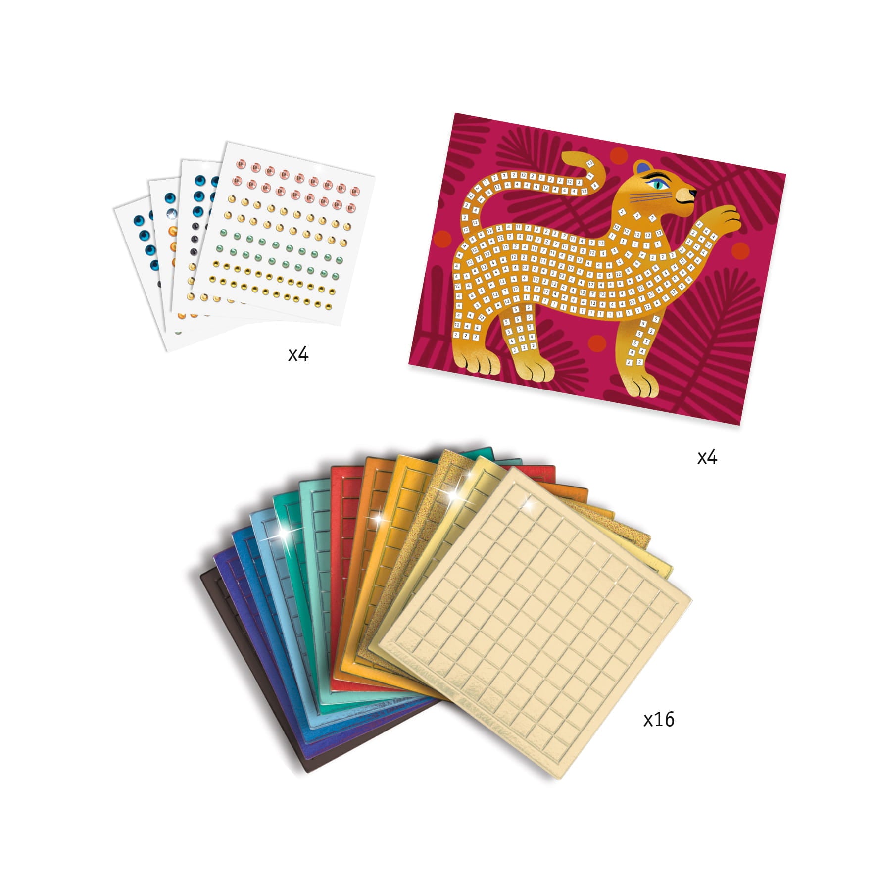 - Zawartość zestawu: 4 szablony, 16 plansz z piankowymi i błyszczącymi mozaikami, 4 arkusze z cyrkoniami