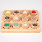 Rozpoznaj i dopasuj 12 drewnianych paneli dotykowych, z każdym posiadającym unikalną powierzchnię o różnych fakturach.