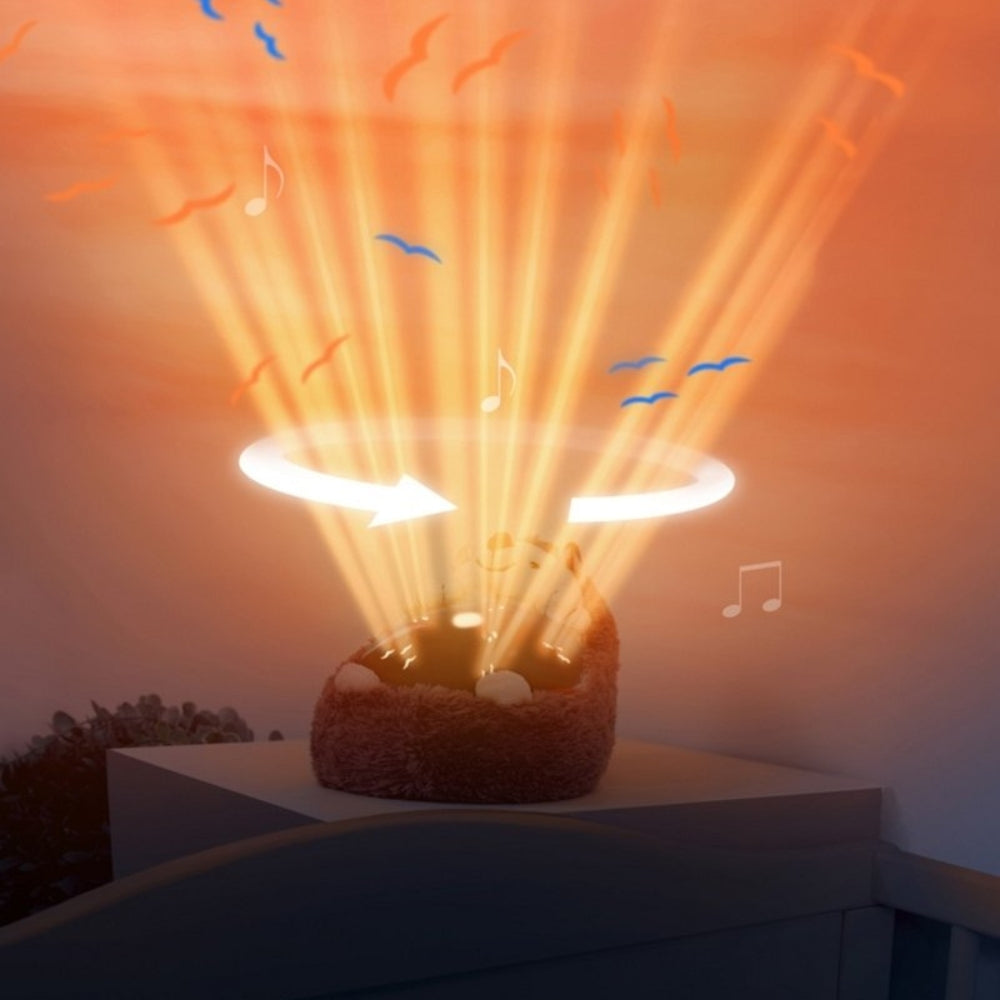 Ten Projektor tworzy realistyczny zachód słońca z fruwającymi ptakami na suficie oraz odtwarza kojące dźwięki, pomagając dziecku wyciszyć się przed snem.