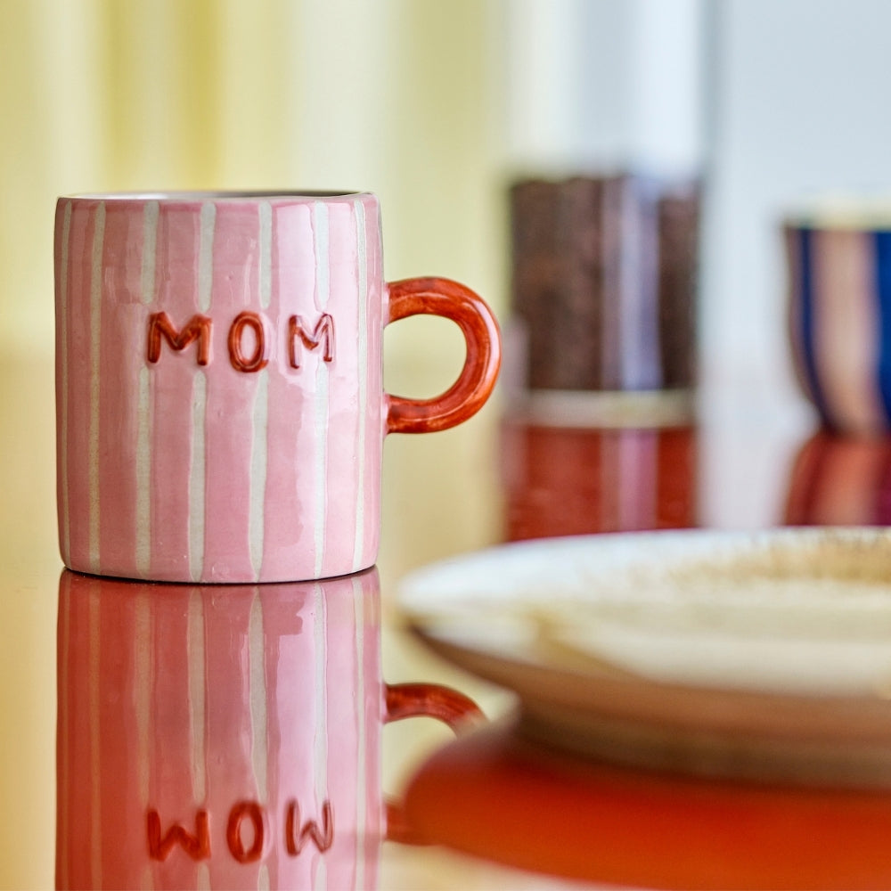 Pionowe, kremowe paski, kontrastowy uchwyt w kolorze terakoty oraz napis „MOM” umieszczony po obu stronach nadają mu ciepły, osobisty charakter i sprawiają, że świetnie sprawdzi się jako prezent.