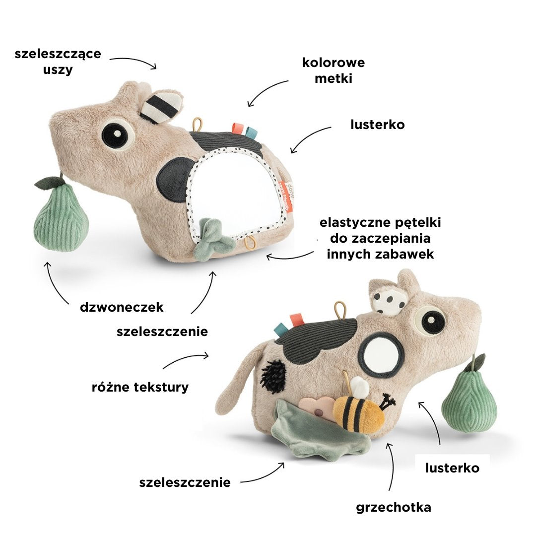 W tym modelu Done by Deer znajdziesz kolorowe metki, zróżnicowane faktury oraz elementy marszczące i grzechoczące, które stymulują zmysły i zachęcają do odkrywania.