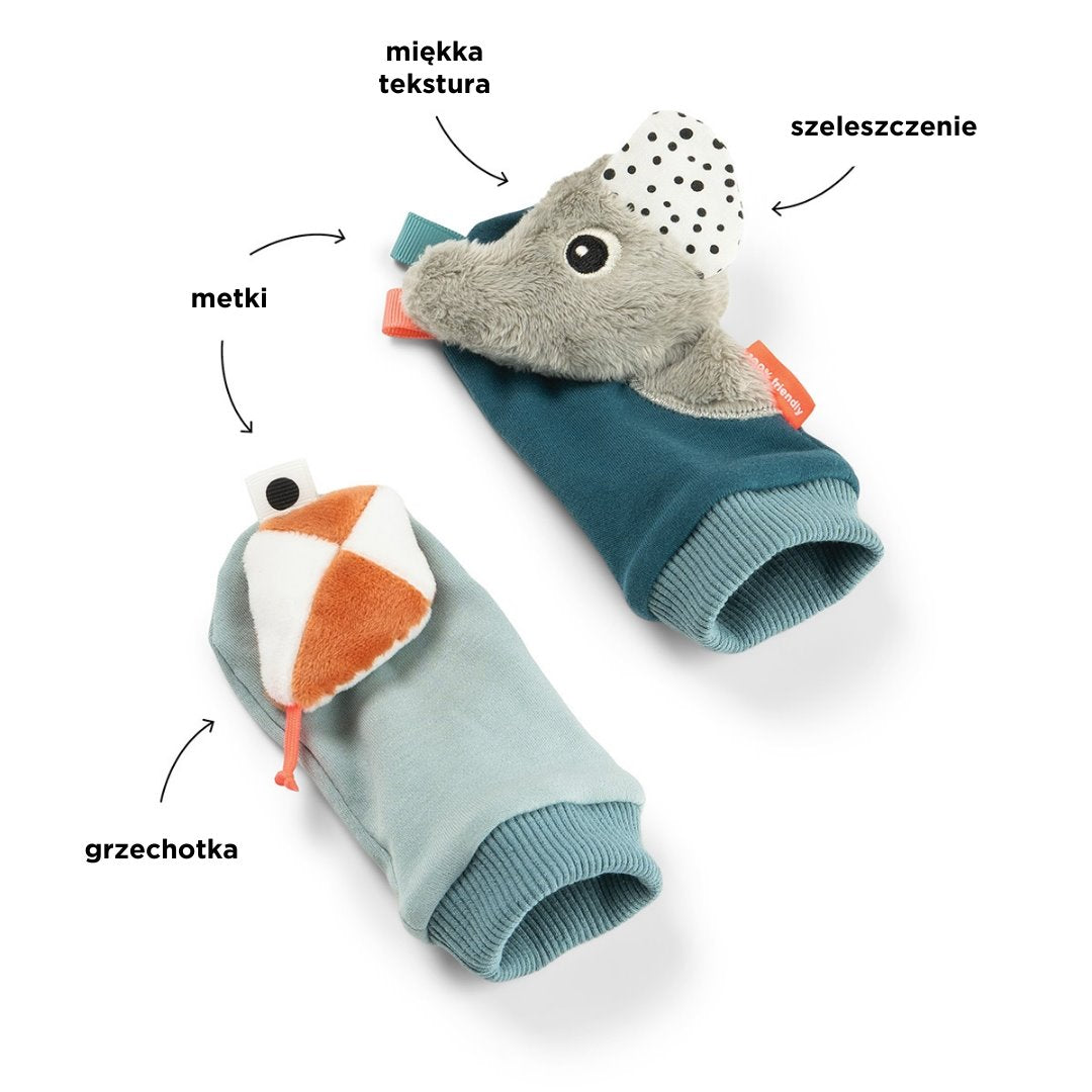 Delikatne grzechotanie i szeleszczące dźwięki aktywują się wraz z ruchem stópek, pokazując zależność przyczyna–skutek w intuicyjny sposób.