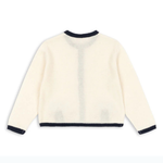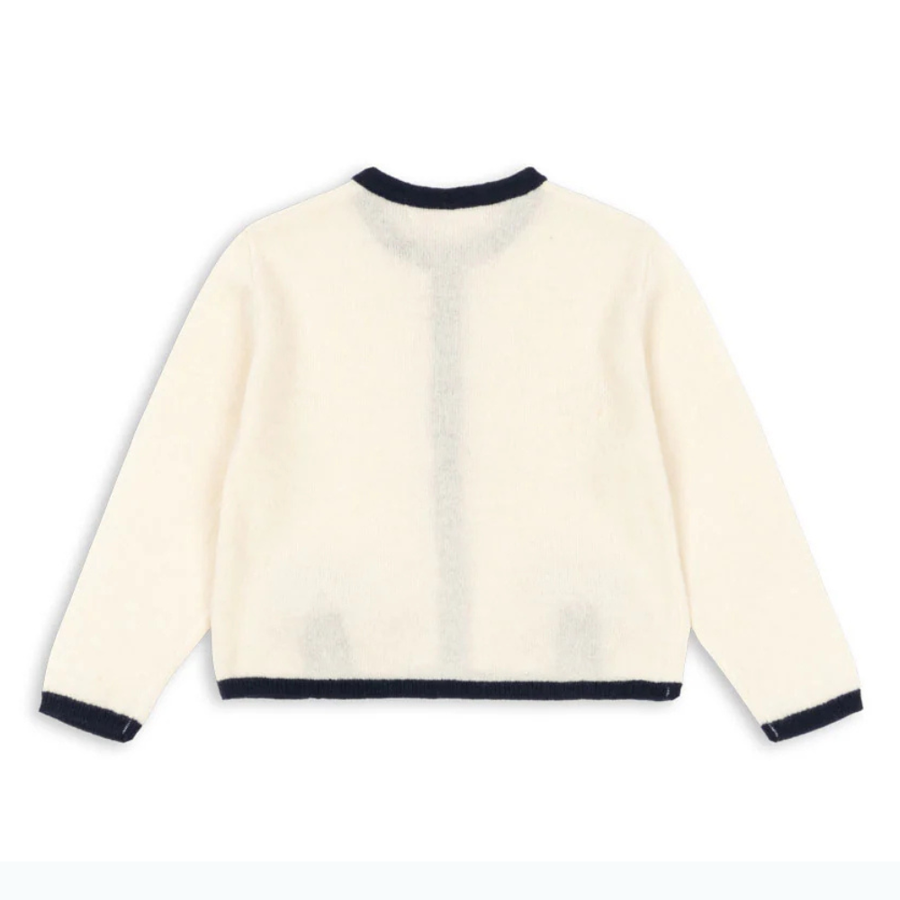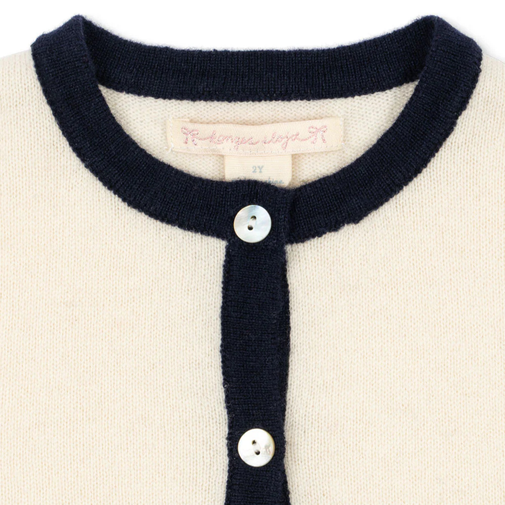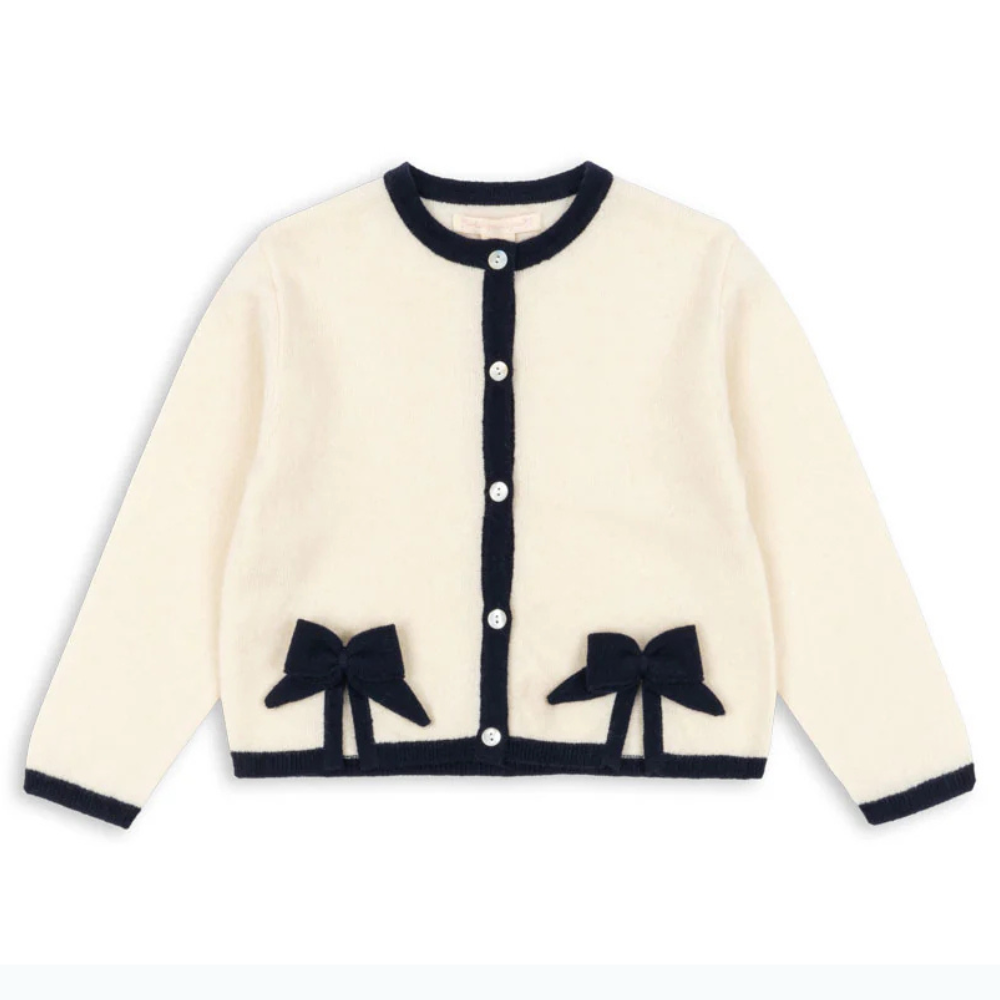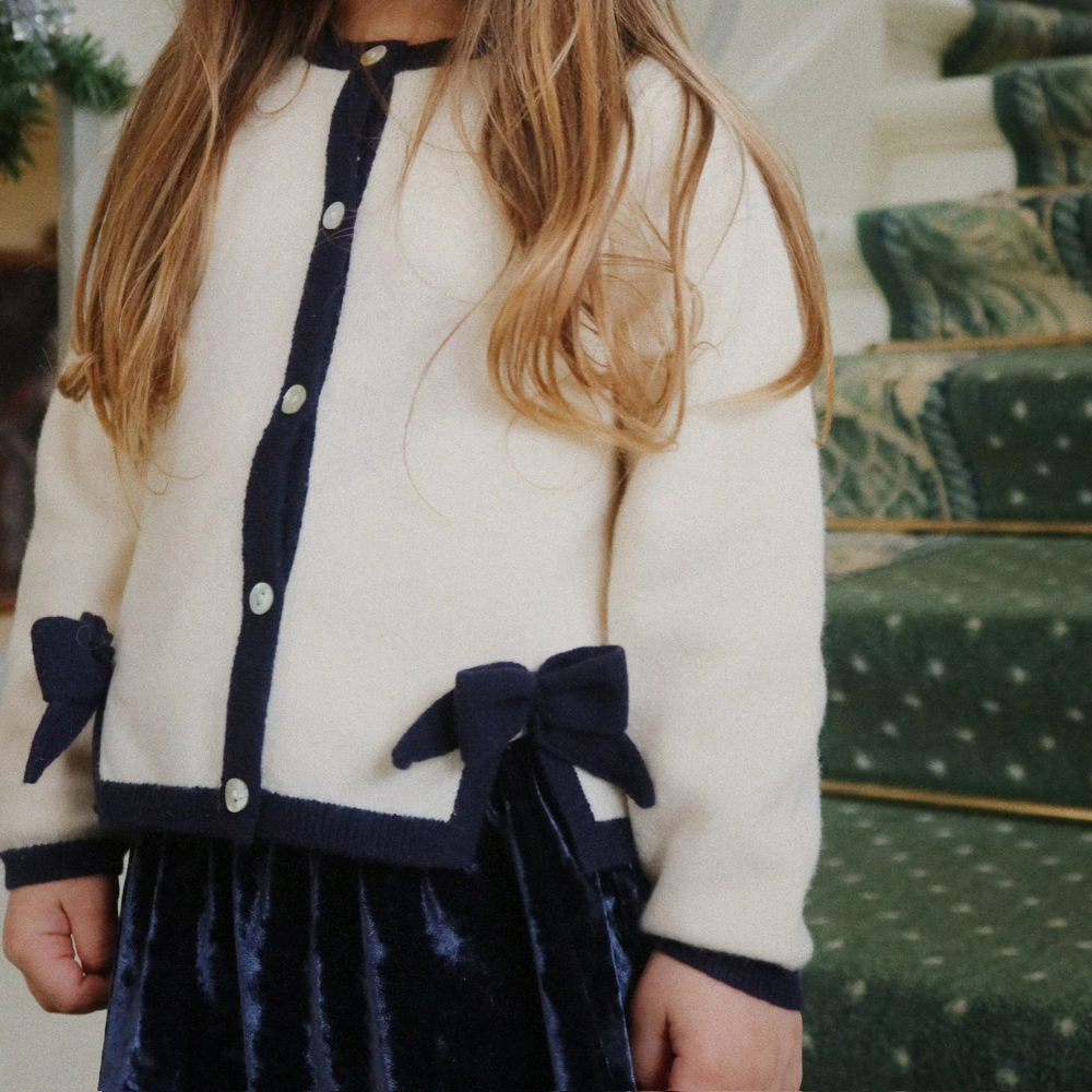 Ten Sweter dziecięcy ma klasyczny krój z okrągłym dekoltem, kontrastowymi lamówkami i guziczkami z masy perłowej; delikatne kokardki dodają mu subtelnego uroku.