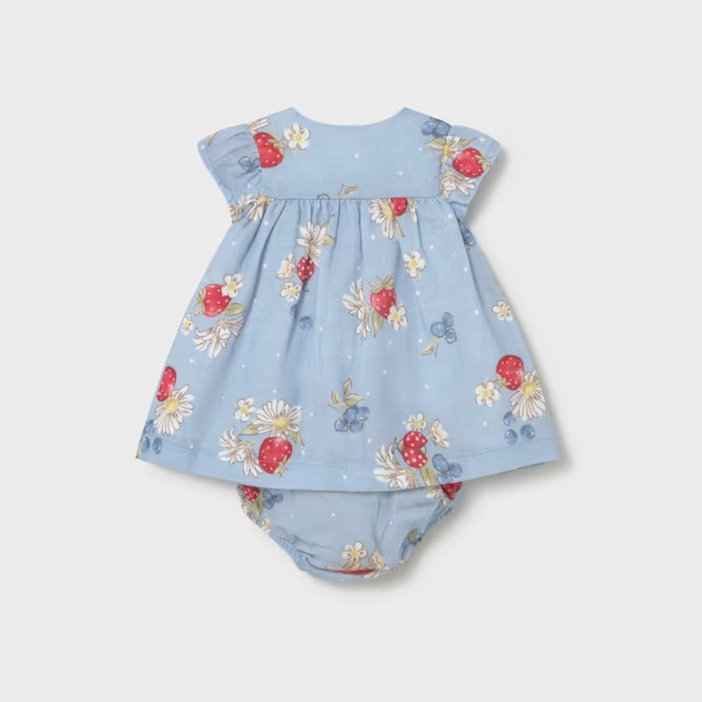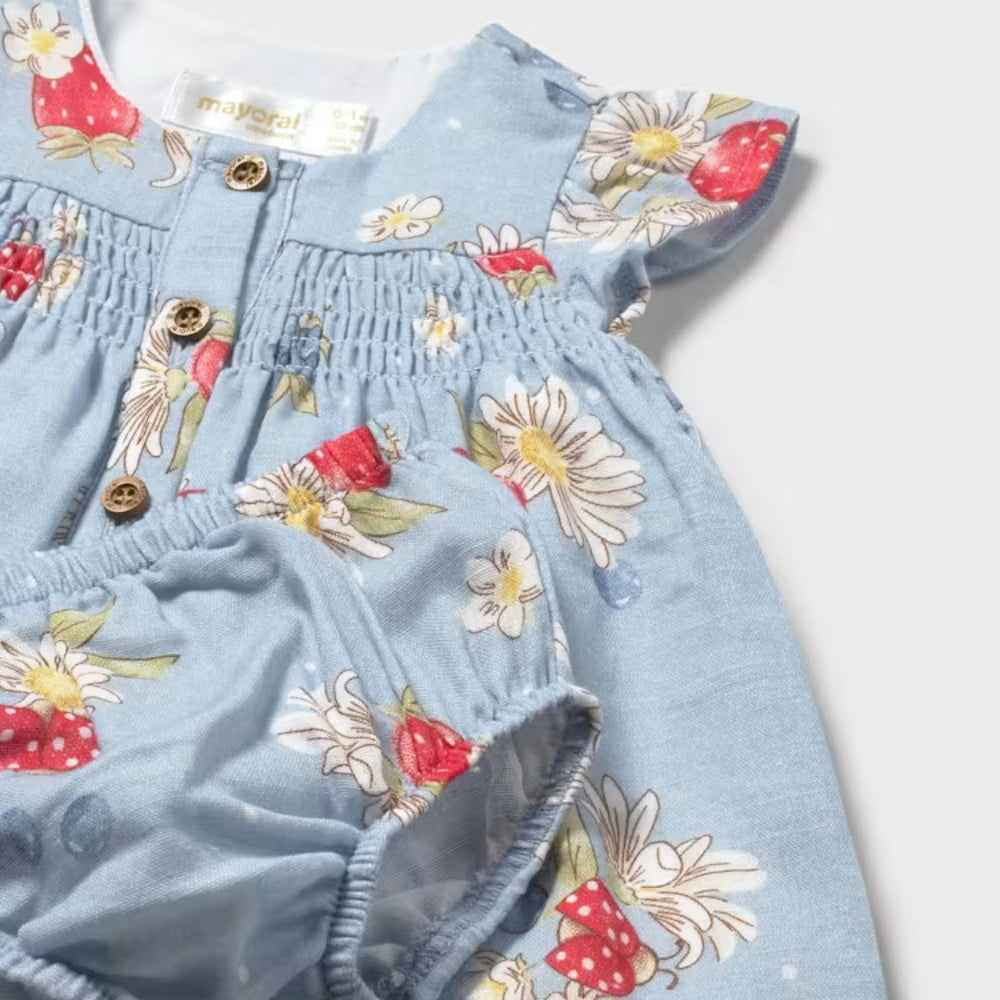 Sukienka dla niemowlaka Mayoral to delikatna propozycja na cieplejsze dni, która zachwyca lekką formą i subtelnym wzorem w owocki.